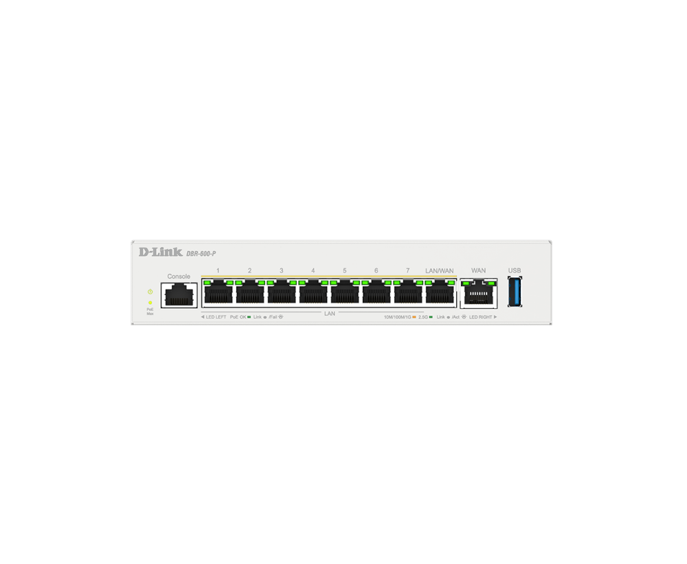 DBR-600-P 配備 2.5G 網路埠,提供更高的吞吐量,支援更快的檔案傳輸和三網融合(2*WAN+1*4G/5G)服務,避免擁塞和延遲,從而提升您的業務即時通訊效率,實現更穩定可靠的連接。其八個 PoE網路埠,供電功率最高可達 123W,可透過網路線同時傳輸電力和數據,使安裝變得輕鬆便捷且成本低廉,非常適合 IP 攝影機和無線基地台等設備。
