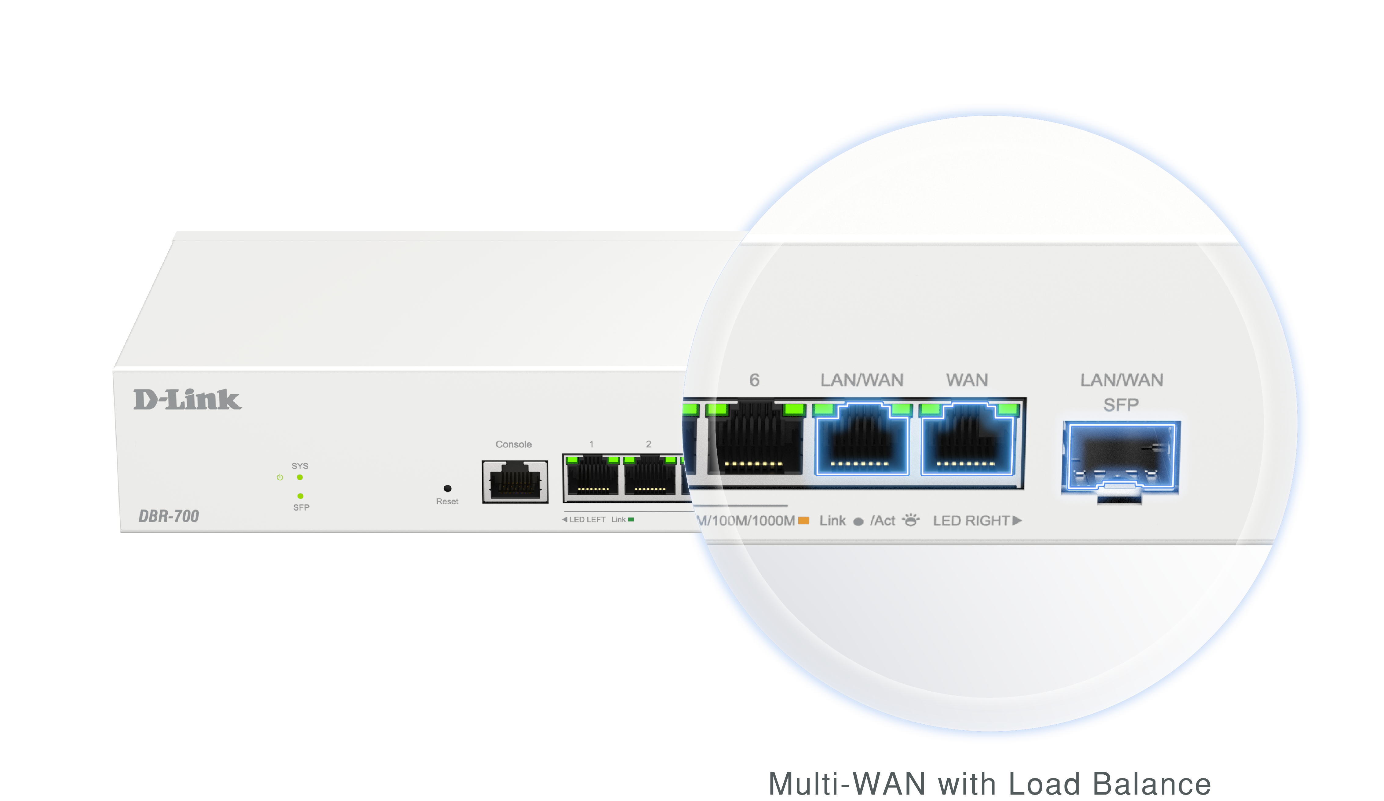 DBR-700 具備多達 3 個 WAN 網路埠,讓您的企業始終保持連接。負載平衡功能可分配網路流量到多個 WAN,防止單一連線過載,平均整體網路用量,並在連線發生故障時,確保仍有備用連線。