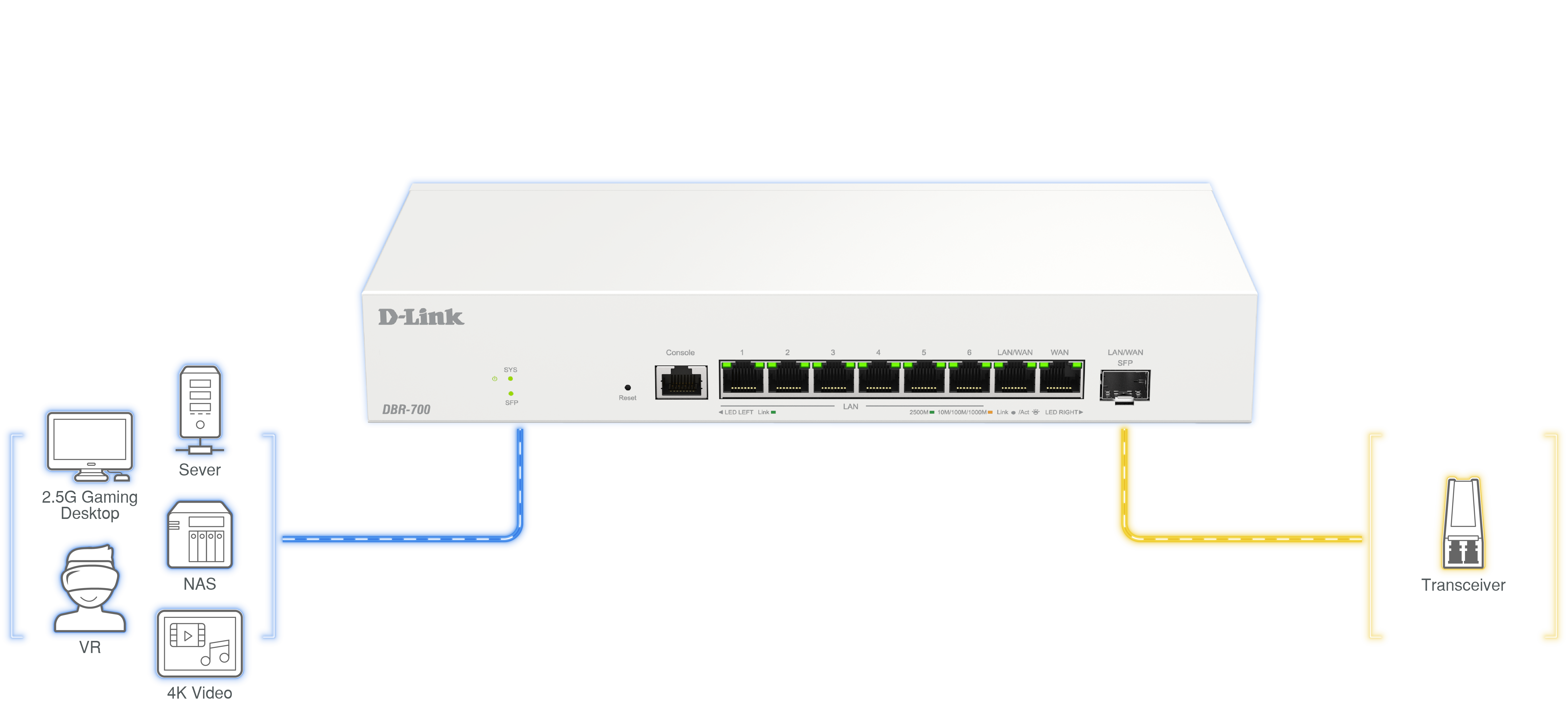 DBR-700 透過其 2.5G 高密度網路埠提供無縫連接,而 SFP 網路埠可實現遠距離、靈活的網路擴展。多個 WAN 網路埠提供可靠穩定的網路服務,有效平衡流量。VPN 通道允許使用者隨時加入辦公室網路,並確保網路限制以提高生產力。此外,內建 AP 管理系統提供對無線設備狀態和身份驗證的集中控制。