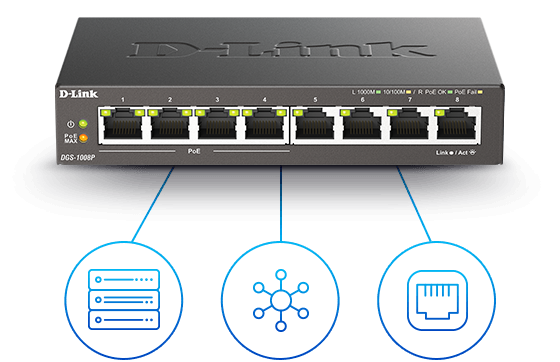The D-Link DGS-1008P 8-Port Gigabit PoE Unmanaged Desktop Switch enables home and office users to easily connect and supply power to Power over Ethernet (PoE) devices such as wireless access points (APs), IP cameras, and IP phones.