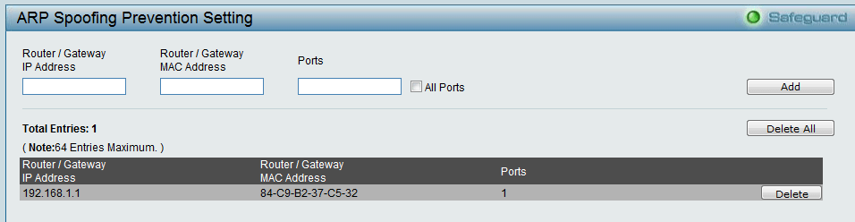Set the above parameters and click “Add” to insert this prevention to its ARP table