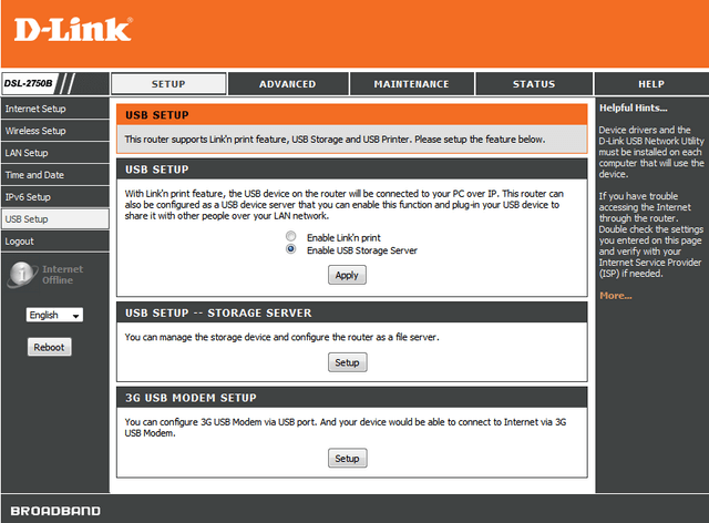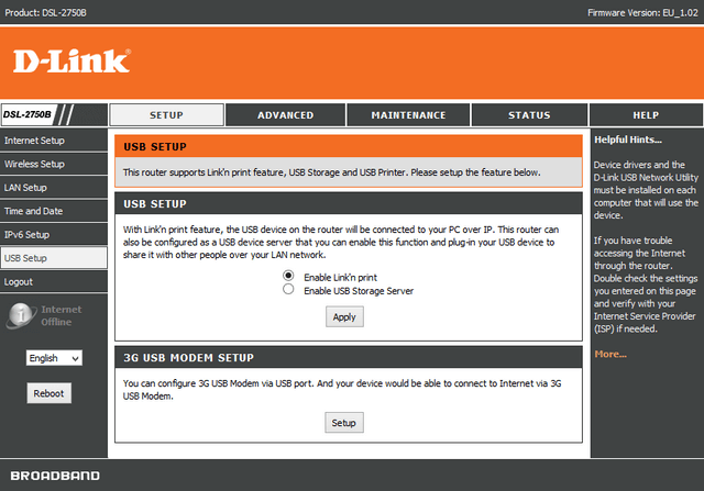 To connect and share a USB printer over the network, you need to click on Enable Link ‘n Print and then click on Apply. Connect your printer, and Reboot the DSL-2750B.