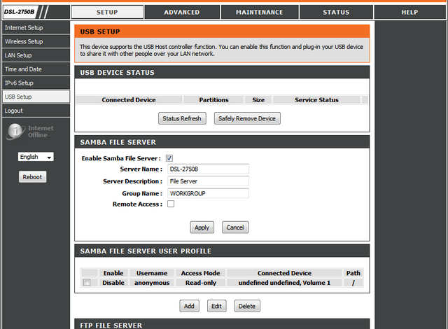 When you want to disconnect the USB device, make sure that nobody is accessing it (you can right-click on it in Windows and select Disconnect Network Drive). On the USB Storage Setup page under USB Device Status, click Safely Remove Device. Wait for the page to reload, and you should see that it has disappeared. You can now safely unplug the device from the DSL-2750B.