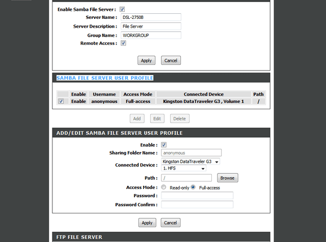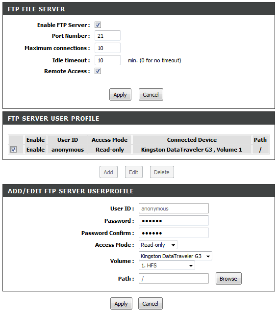 - After you click Apply, an FTP User Profile will appear underneath. Tick the box to the left and then click Edit. Here you can set the User ID (in the default profile this is set to 'anonymous' and cannot be changed. You can add another profile with your chosen ID), Password, Access Mode (Read-only or Full-access), Volume (device and partition. There will only be one device, but if you have more than one partition on the device, you can choose which to allow access to) and Path (clicking Browse here enables you to allow access only to a specific folder on the selected partition. Selecting the folder with no name (the Root folder) grants access to all of the folders on the partition).