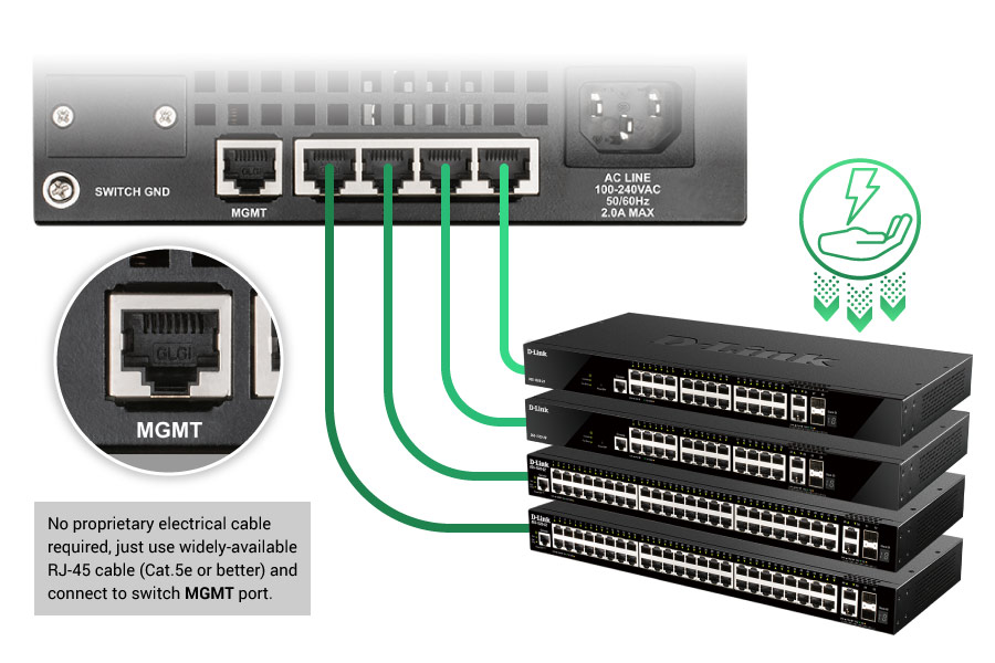 For a more resilient network infrastructure, connect up to four DGS-1520 switches (non-PoE models only) with the DPS-520 PoE redundant power supply system through the management port and actively back-up four devices to significantly reduce power redundancy costs.