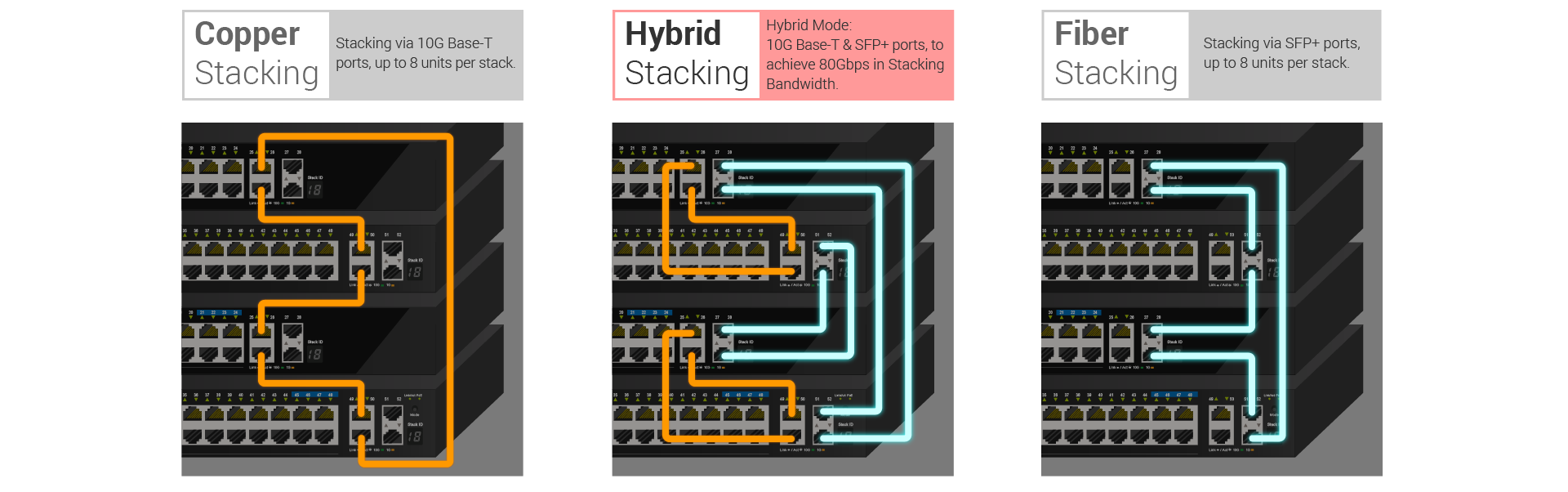 10 GB Base-T and/or SFP+ (fiber) ports for stacking or uplink