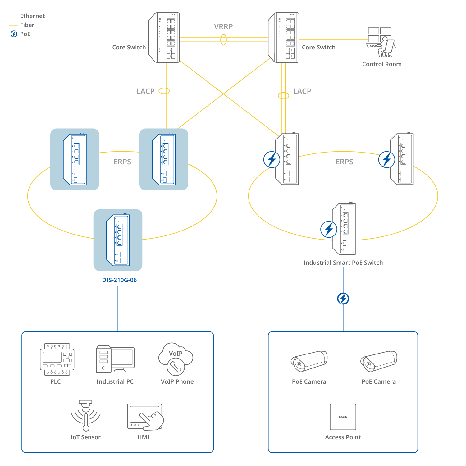The DIS-210G-06 is an industrial smart switch equipped with four 1G ports and two 1G SFP ports for network management and aggregation. The SFP ports support long-distance data transmission, rapid failover redundancy, and throughput aggregation. The DIS-210G-06 supports ERPS and static routing, which reduces latency, enables effective traffic control, and improves network scalability and efficiency.