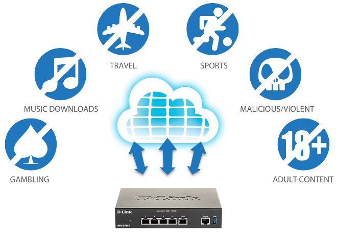 The DSR-250V2 also provides a web content filtering feature to help administrators monitor, manage and control employees’ Internet usage. Static web content filtering helps to remove malicious objects such as Java applets, ActiveX, and cookies or to block URLs by keyword. Dynamic web content filtering, which requires a license subscription, allows administrators to filter content from a list of categories. Multiple global index servers, with millions of URLs and real-time website data, enhance performance and maximize service availability.