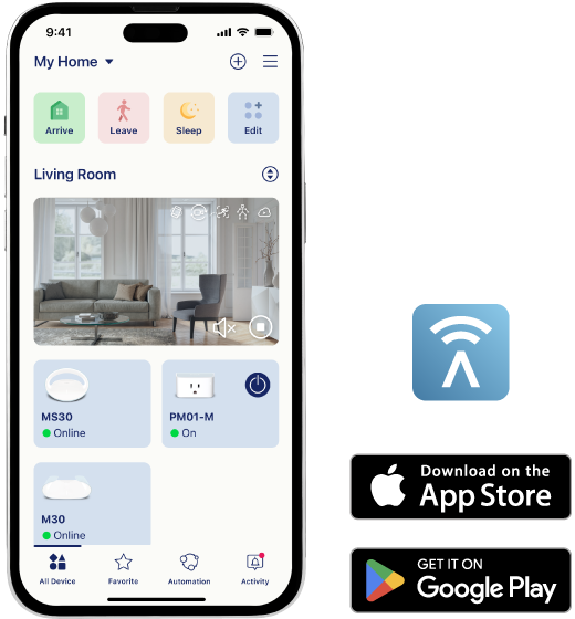 Once paired with your home Wi-Fi, you can manage connected devices through the D-Link AQUILA PRO AI App on your appropriate internet-connected smartphone. Turn connected appliances on or off, set schedules, and check usage - even when you’re away from home.