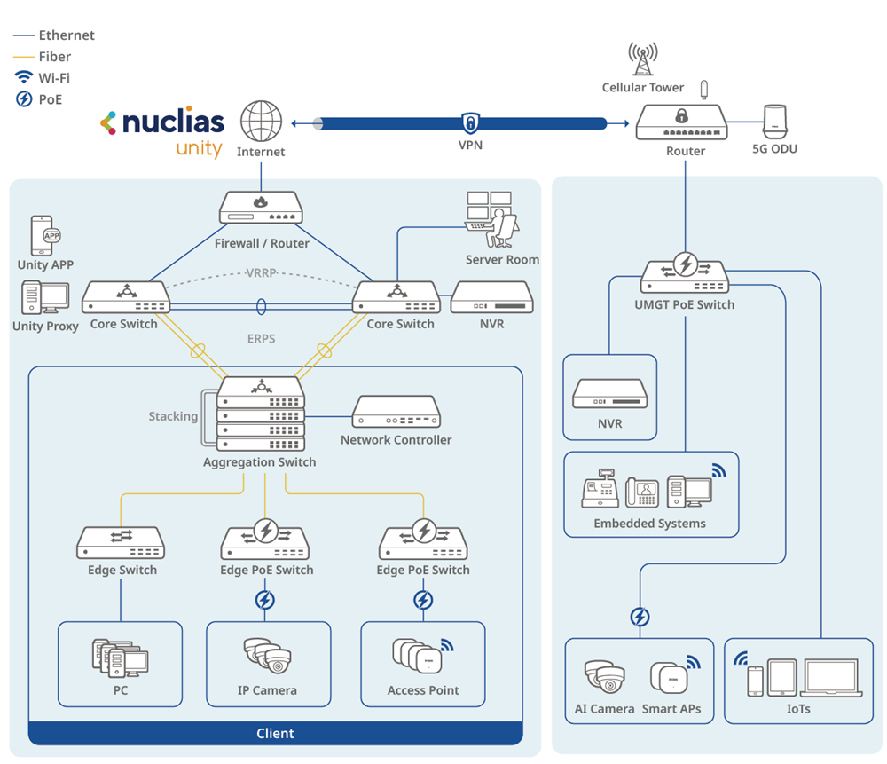 Nuclias Unity provides full network visibility and control through a real-time dashboard with power and resource insights, intuitive topology mapping, and centralised device management. With Wi-Fi Planner Pro, flexible multi-SSID configuration, port profile management, and granular access control, it enables efficient and secure network operations.