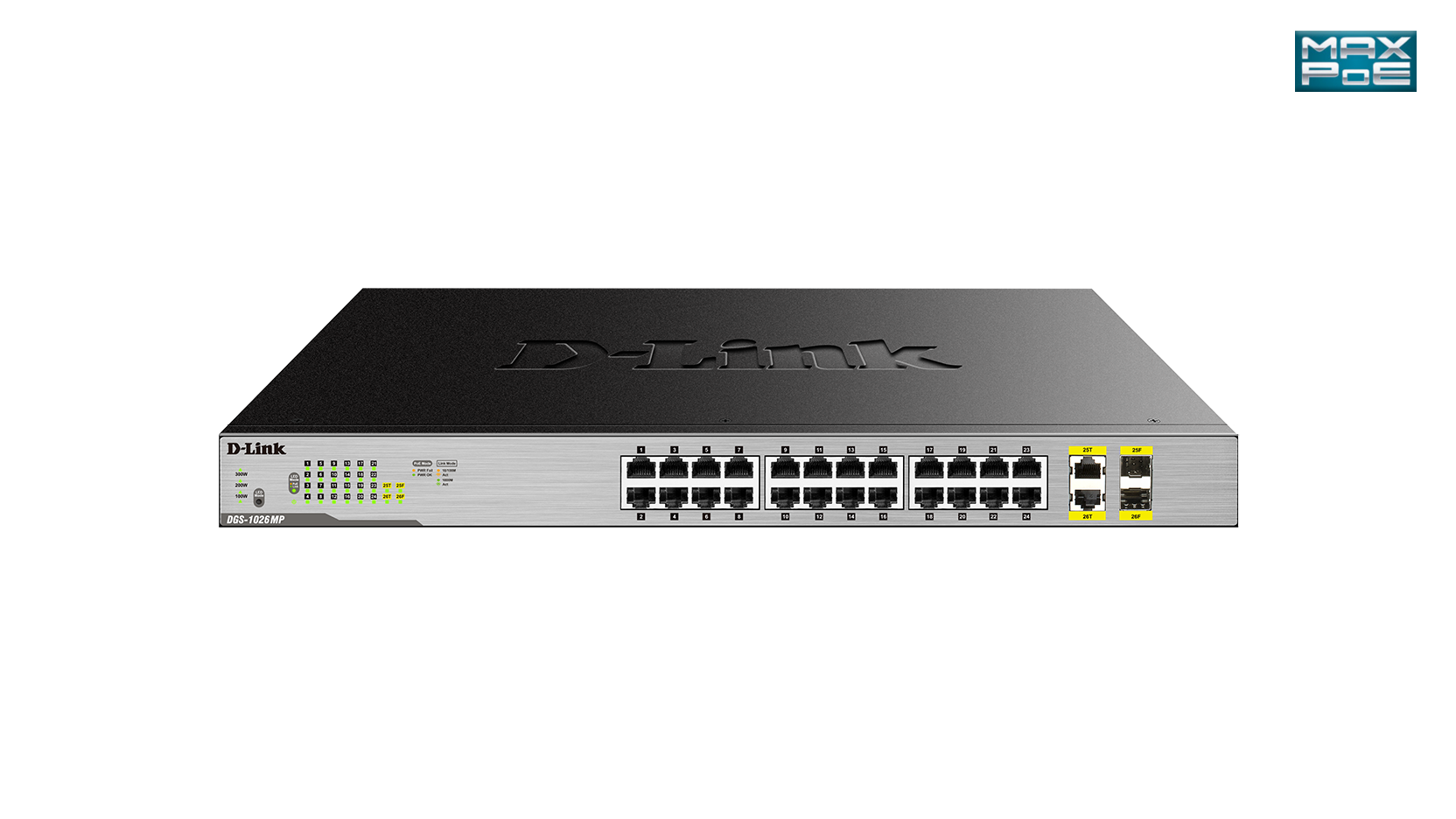 The D-Link DGS-1026MP 26-Port Gigabit Max PoE Switch enables users to easily connect and power PoE-capable devices such as wireless access points (APs), IP cameras, and IP phones. Each of the 24 PoE ports can supply up to 30 W, with a total PoE budget of 370 W.